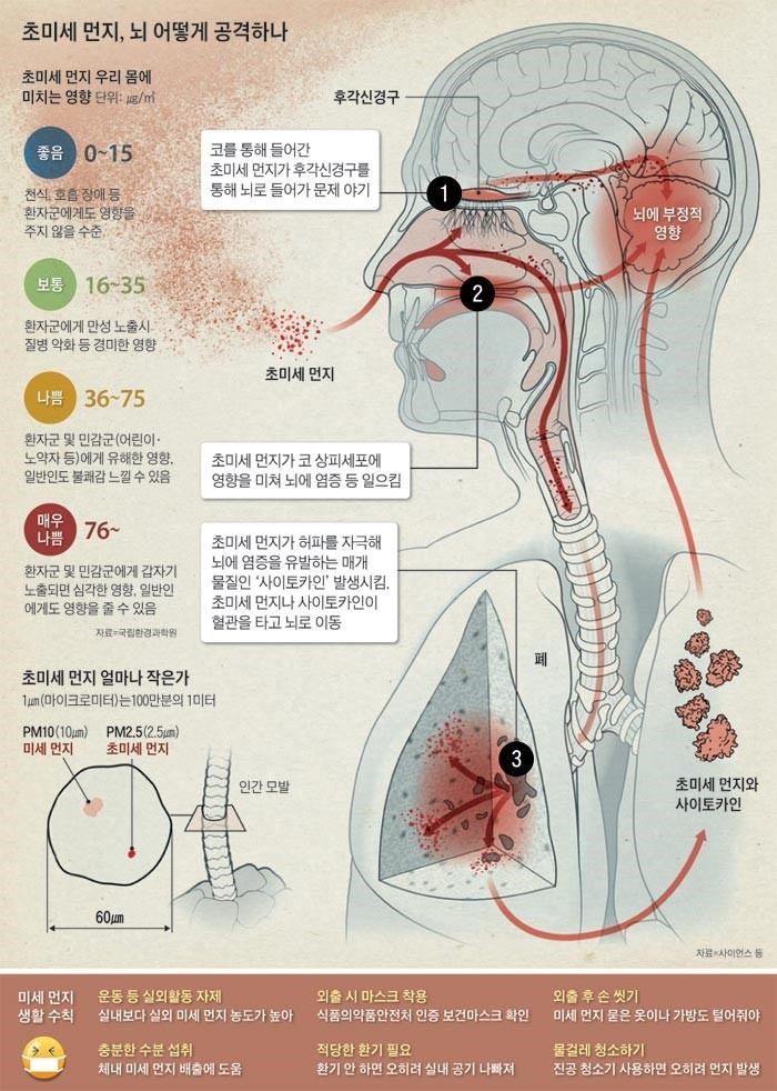 코로 들어온 초미세먼지는 혈관을 타고 바로 뇌 공격, 뇌졸중 등 유발. 뇌에는 BBB(Blood Brin Barrier, 혈액 뇌 장벽)라는 구조가 있어서 이물질이 뇌로 들어오는 것을 막는데, 초미세 먼지는 크기가 작아 이를 통과하여