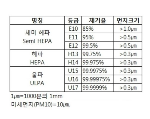 헤파필터의 등급은 표에서처럼 E10 등급부터 U17등급이 있습니다. E10 등급은 85%의 공기를 걸러 낼 수 있고