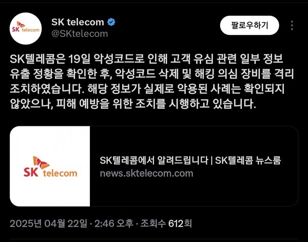 대응 조치를 취했으며, 불법 유심 기변 및 비정상 인증 시도 차단 등 추가 보안 강화에 나섰습니다.